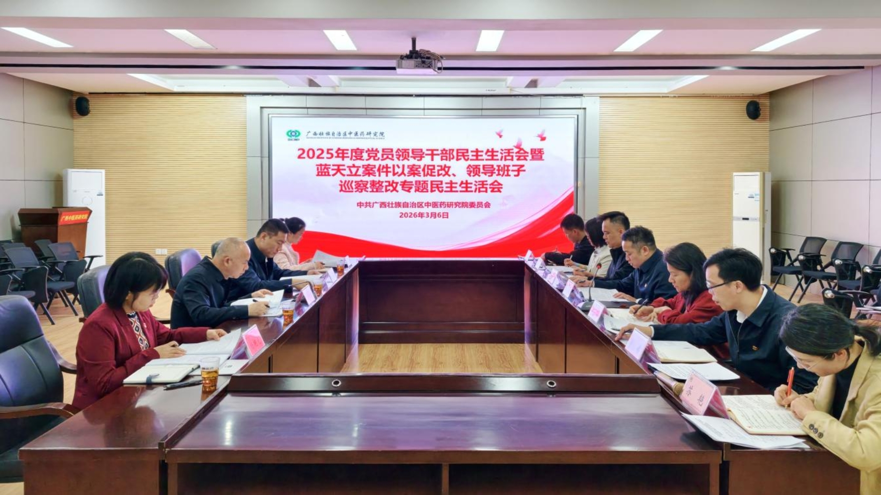 3月6日,广西中医药研究院党委召开2025年度党员领导干部民主生活会暨案件以案促改、领导班子巡察整改专题民主生活会,自治区卫生健康委党组成员,自治区中医药局党组书记、局长黎甲文到会指导并作点评,自治区卫生健康委药政处处长吴帅、自治区中医药局科教处处长杨艳光、自治区卫生健康委药政处一级主任科员张逸敏到会指导。会议由研究院党委书记、院长赖克道主持,院领导班子成员参加,有关部门负责人列席。