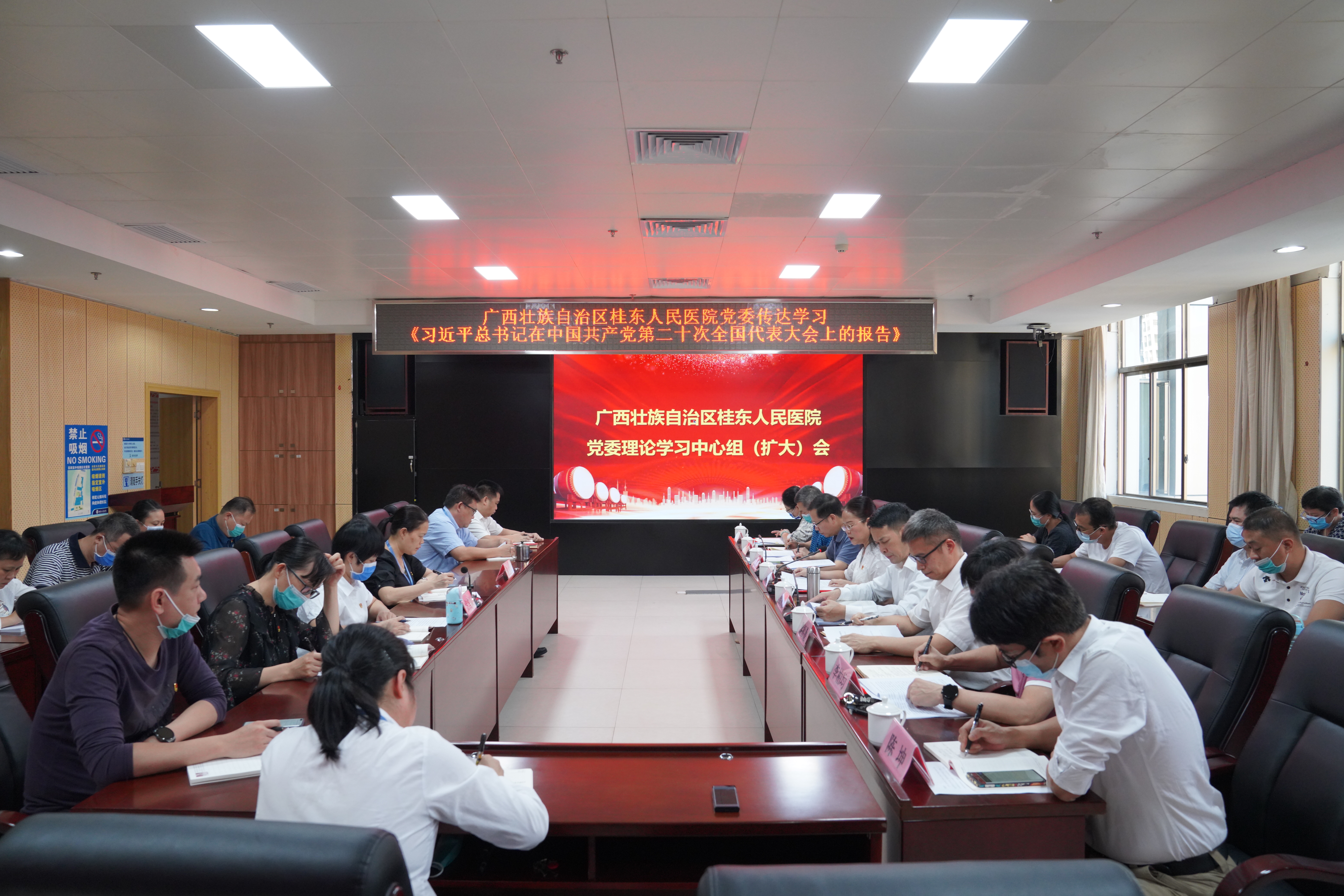 2022年10月25日,广西桂东人民医院召开党委理论学习中心组(扩大)会议,专题学习领会党的二十大精神实质,并结合医院各项工作,交流研讨学习收获和感悟。院党委书记蒋柳结,党委副书记、院长吴家恩等在家党政班子成员及各党支部书记、各职能科室负责人参加会议。