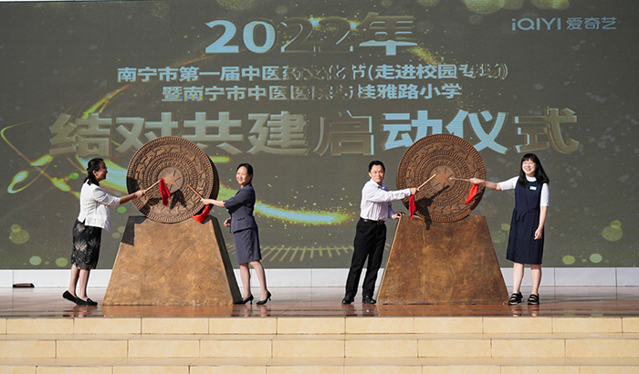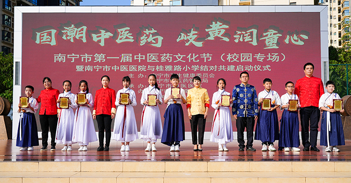 活动当天,南宁市中医医院与南宁市桂雅路小学进行结对共建。在周一升旗仪式后,南宁市第一届中医药文化节(走进校园专场)在浑厚响亮的铜鼓声中拉开帷幕。随后,上演了中医养生保健操《五禽戏》,开展了趣味中医药小课堂《一株小草如何改变世界》,并选拔10名学生担任南宁市第一届中医药文化节的“小小中医药宣传大使”。
