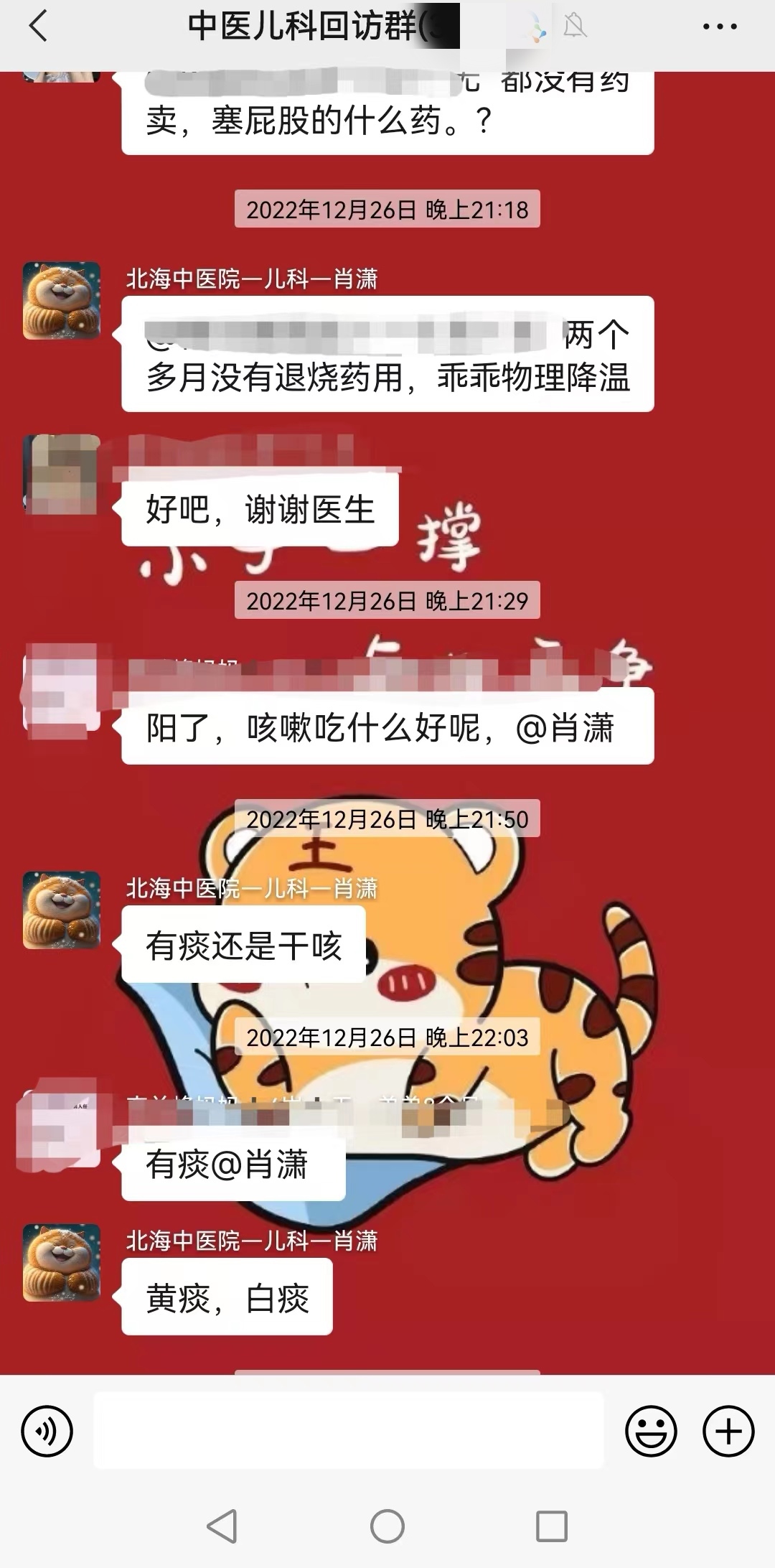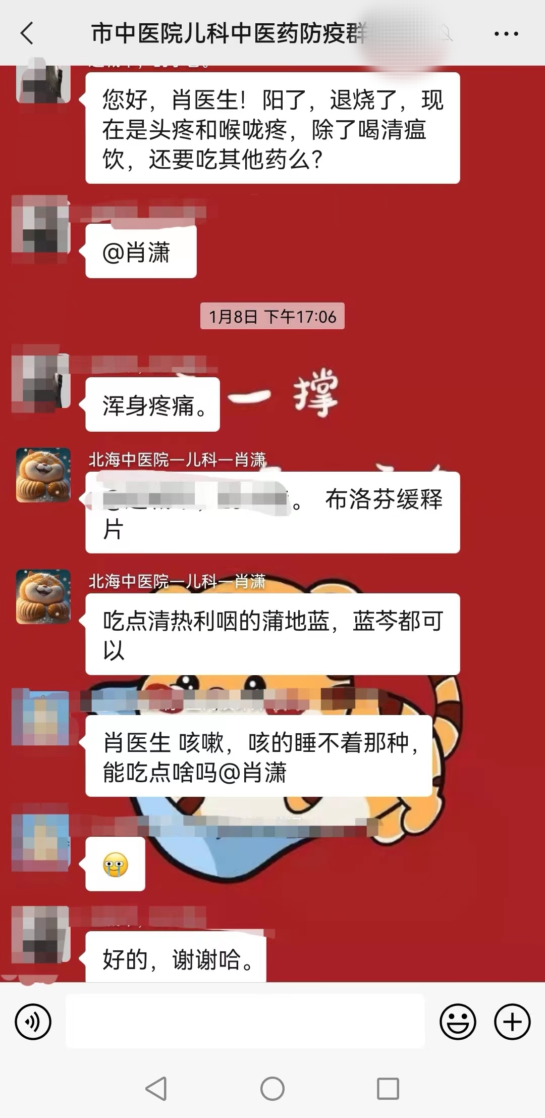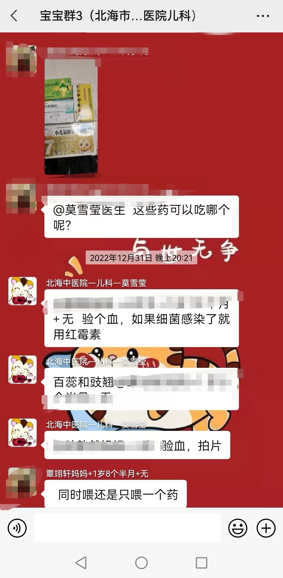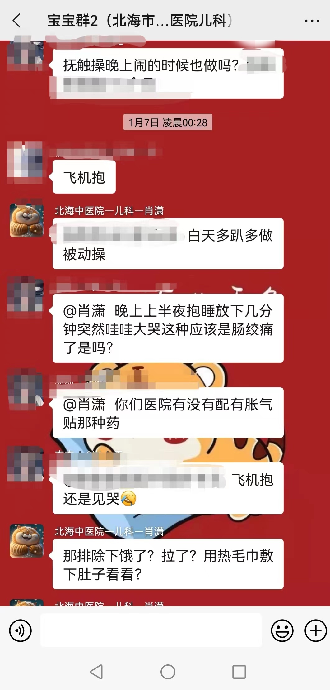 由于很多幼龄宝宝不方便来院就诊。该院儿科迅速组织医护人员在建立的各儿童微信群里在线咨询答疑。
