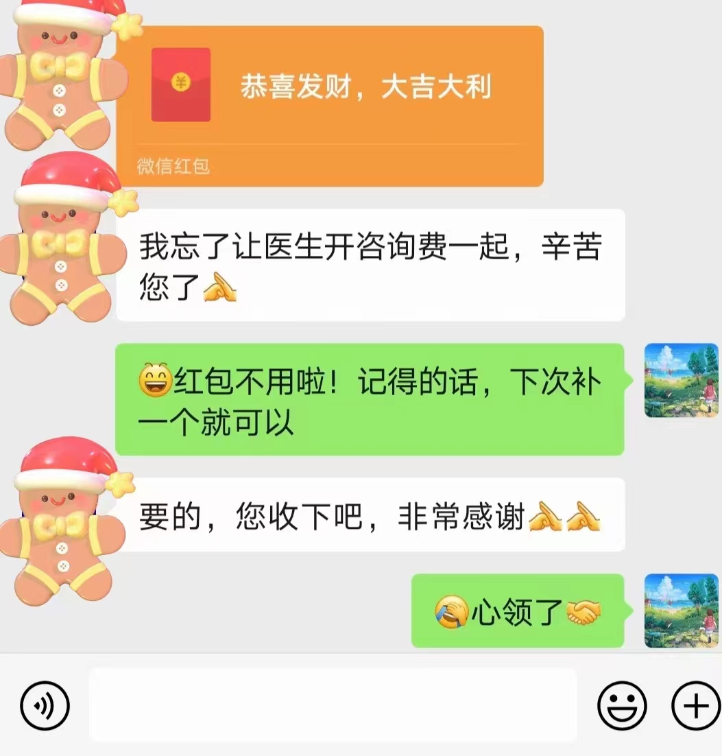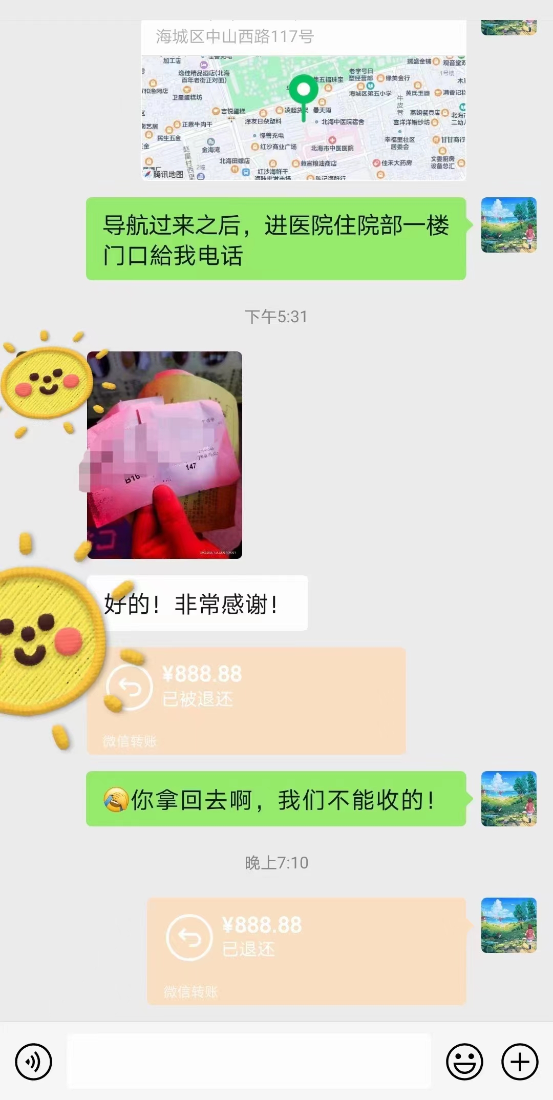 2022年12月23日,一名由甘肃远道而来的外地家长,打电话给陈娜护士长,告知小朋友高烧不退,不懂如何在当地求医,在外面也买不到退烧药,万分着急。因为担心他们人生地不熟,陈娜护士长第一时间加了家长的微信,一路悉心引导,顺利至该院就医。患儿第一时间得到了我科肖潇主任的及时诊疗,通过我科独有的儿童中医外治和口服用药之后,孩子两个小时之后顺利退烧,病情得到缓解,家长难表感激之情,微信发来888.88元的红包。陈娜护士长跟家长解释了医务人员不能够收受红包,但同时感谢他的信任和支持之后,当时退还其微信红包。一周后,这位家长也因感染新冠发烧,在护士长的帮助下顺利住进医院。