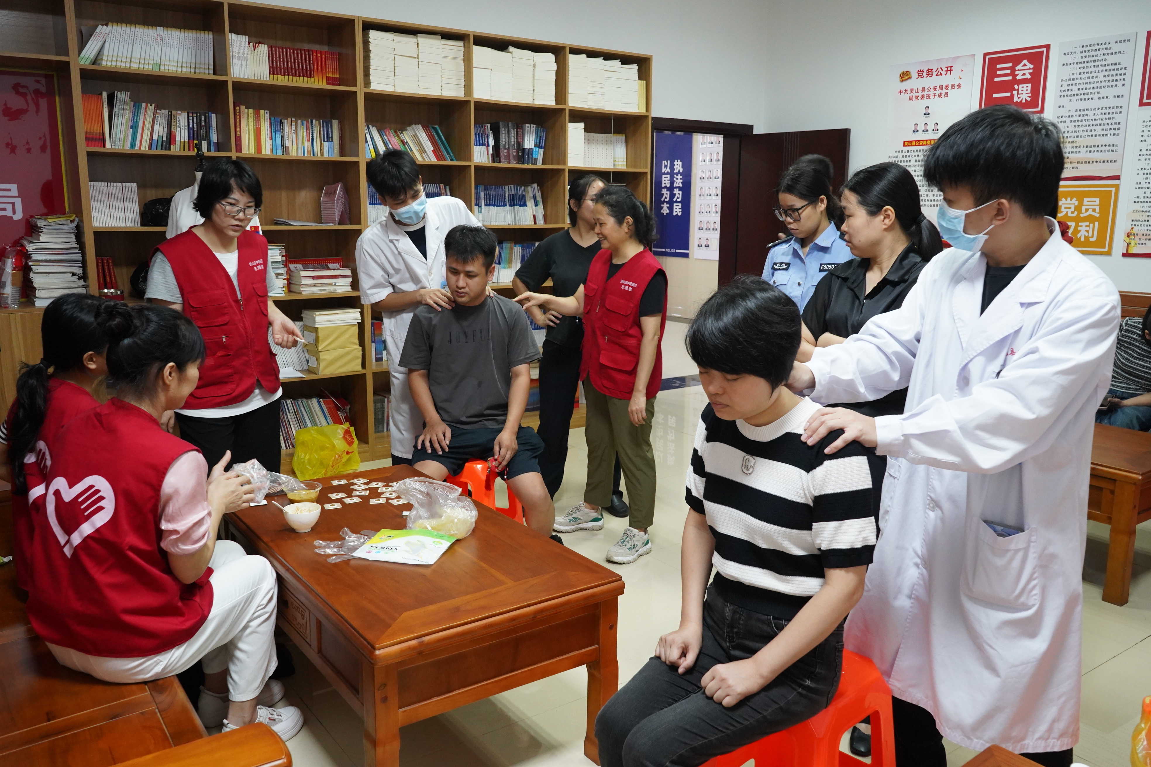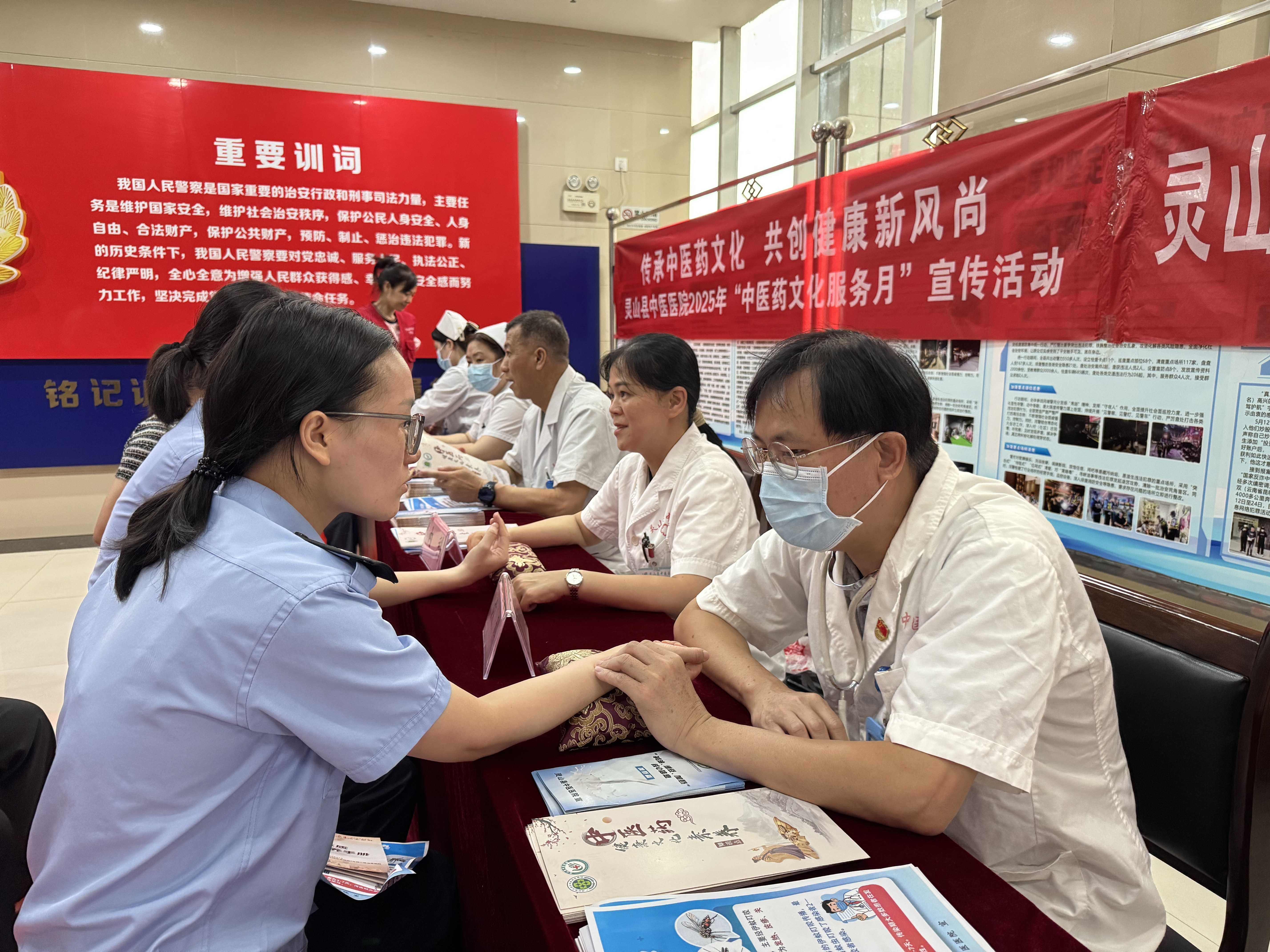 为进一步推动优质文化资源直达基层,充分发挥中医药文化宣传教育基地的文化服务功能,更好满足群众的中医药文化需求,8月6日,灵山县中医医院组织内科、外科、康复科等专家团队及党员志愿者走进县公安局,开展以 “传承中医药文化 共创健康新风尚”为主题的中医药文化服务月义诊宣传活动,为县公安局干警们送上一份特殊的健康关怀。