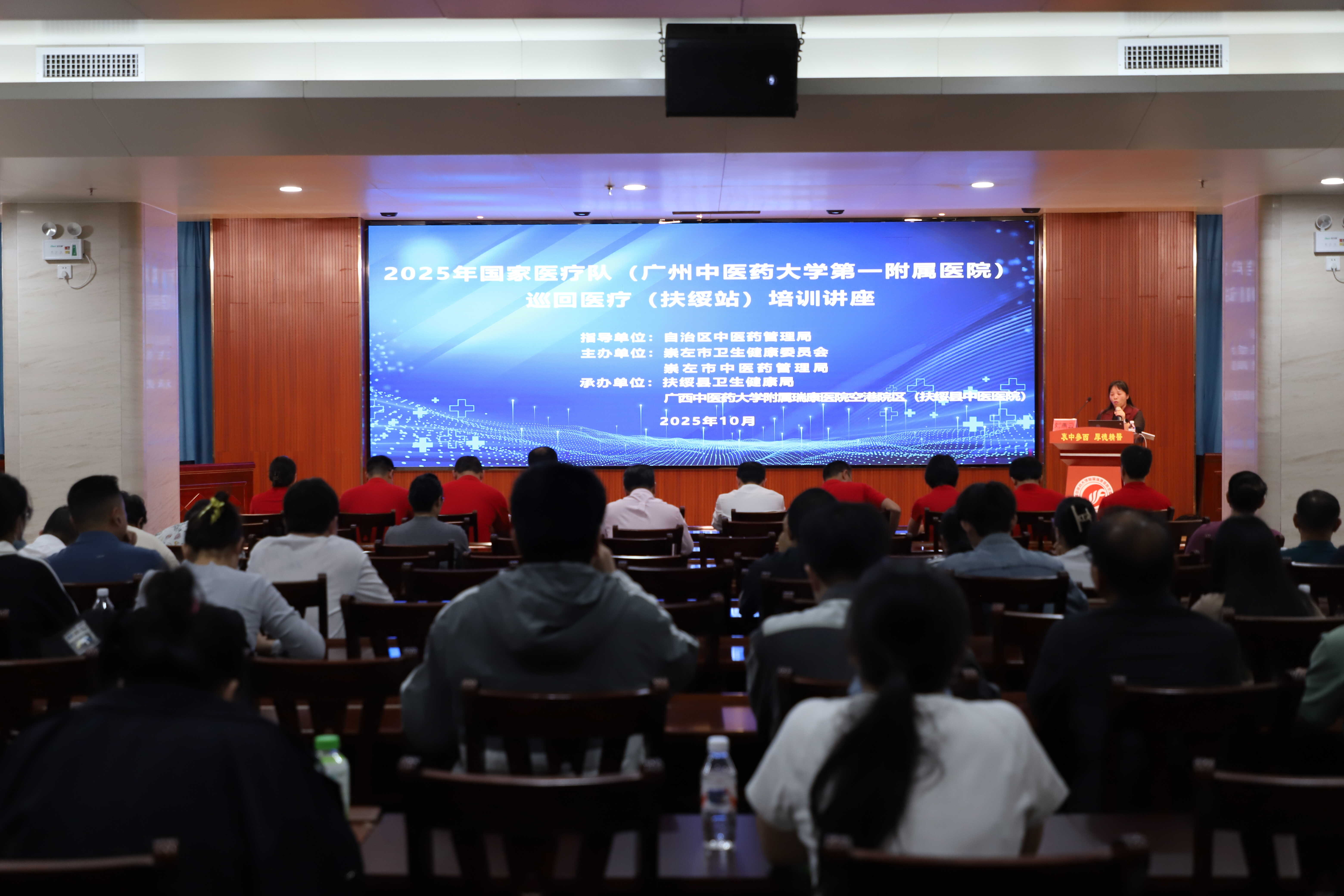 10月29日上午,2025年国家医疗队(广州中医药大学第一附属医院)巡回医疗(扶绥站)启动仪式在扶绥县中医医院示教室举行。扶绥县人民政府副县长柳燕,广西中医药大学附属瑞康医院党委书记高宏君,国家巡回医疗队队长、广州中医药大学第一附属医院骨伤中心运动医学科副主任医师李杰,扶绥县卫生健康局局长李华剑,广西中医药大学附属瑞康医院副院长、总会计师唐盛军,扶绥县中医医院党总支书记曹步清,执行院长周永喜出席仪式。国家医疗队(广州中医药大学第一附属医院)专家,扶绥县中医医院临床科室负责人及扶绥县各医疗卫生机构代表共百余人参加仪式。仪式由李华剑主持。