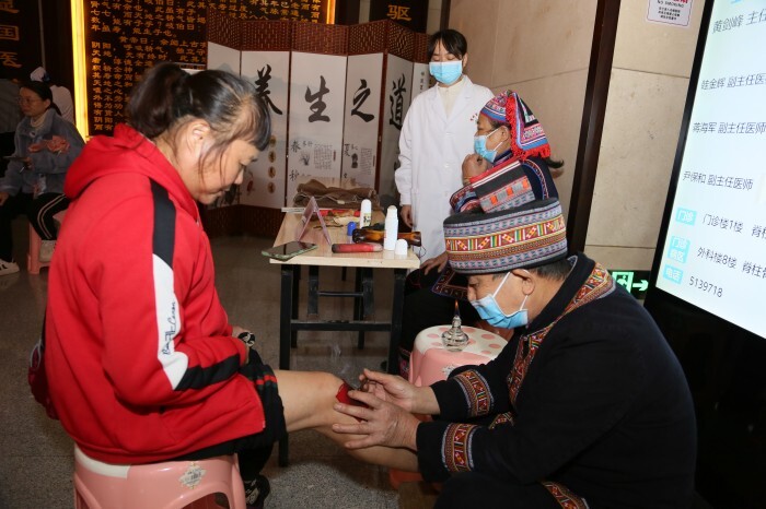 本次义诊由医院治未病科、瑶医及中医护理团队联合开展。在活动现场,治未病科专家团队坐诊,为前来咨询的市民细致辨证、答疑解惑,并针对个人体质特点,定制个性化的三九贴、三九灸调理方案。现场开设“一站式养生护航”体验区,市民可免费进行中医体质辨识与12经络检测,科学了解自身体质特点与经络状态。同时,中医护理特色疗法团队为市民提供耳穴疗法、铜砭刮痧、杵针疗法等免费体验,不少市民在现场亲身感受了中医外治法的温热与舒缓。膏方品鉴区也备受欢迎,医师根据市民体质现场指导,提供补气养血、温阳补肾等冬季膏方定制建议。