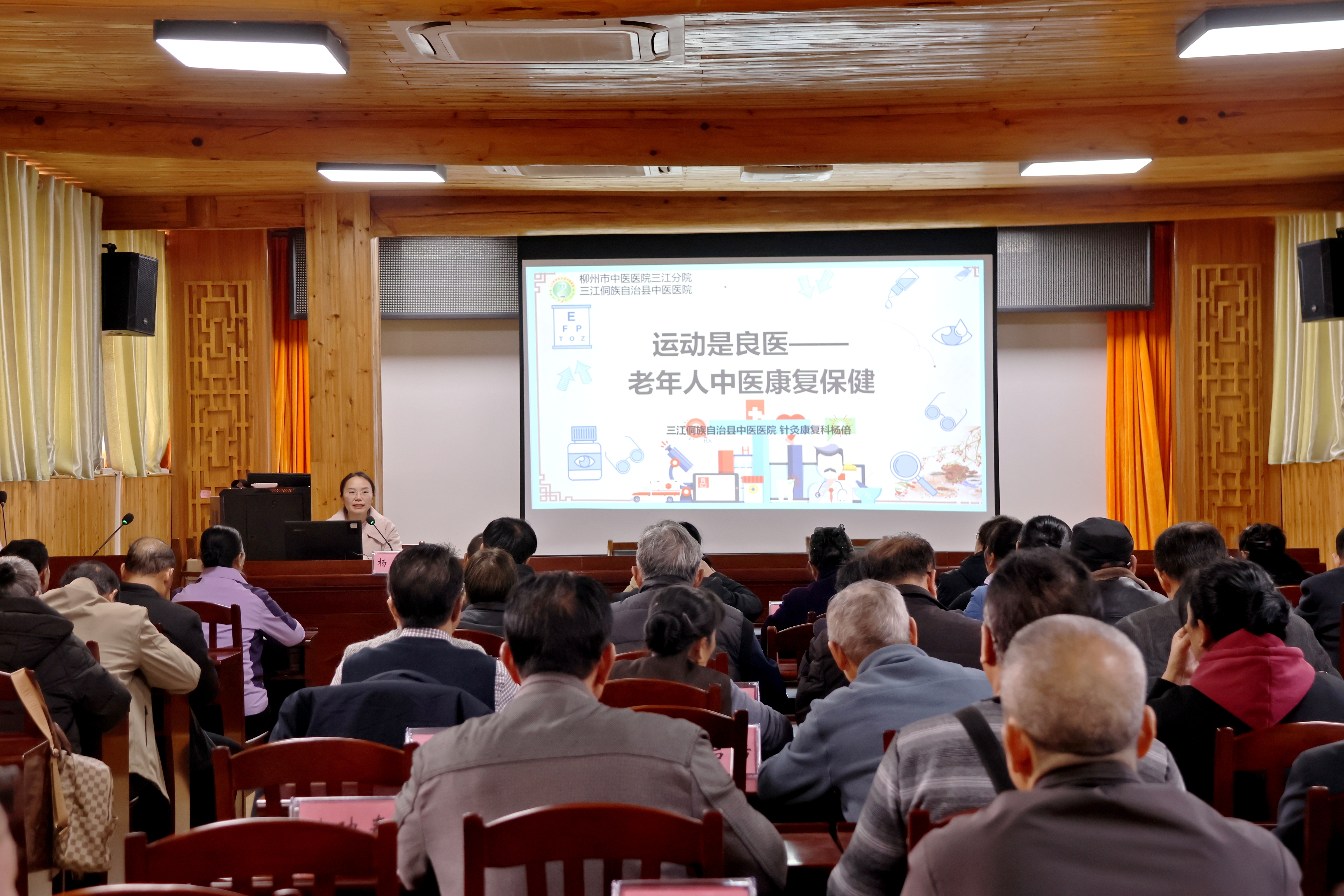 杨倍则围绕“运动是良医——老年人中医康复保健”主题,立足中医“形神共养”理念,系统讲解了运动养生的核心要点。她重点推介了太极拳、八段锦等适合老年人的中医导引术,详解各类功法的保健功效与核心原理。针对慢性病患者,杨倍特别强调运动安全,给出“微汗不疲劳”的强度标准。授课最后,她还为大家播放了科室自制简易健身操教学视频,视频动作简单易学、节奏舒缓,非常适配老年人身体状况。