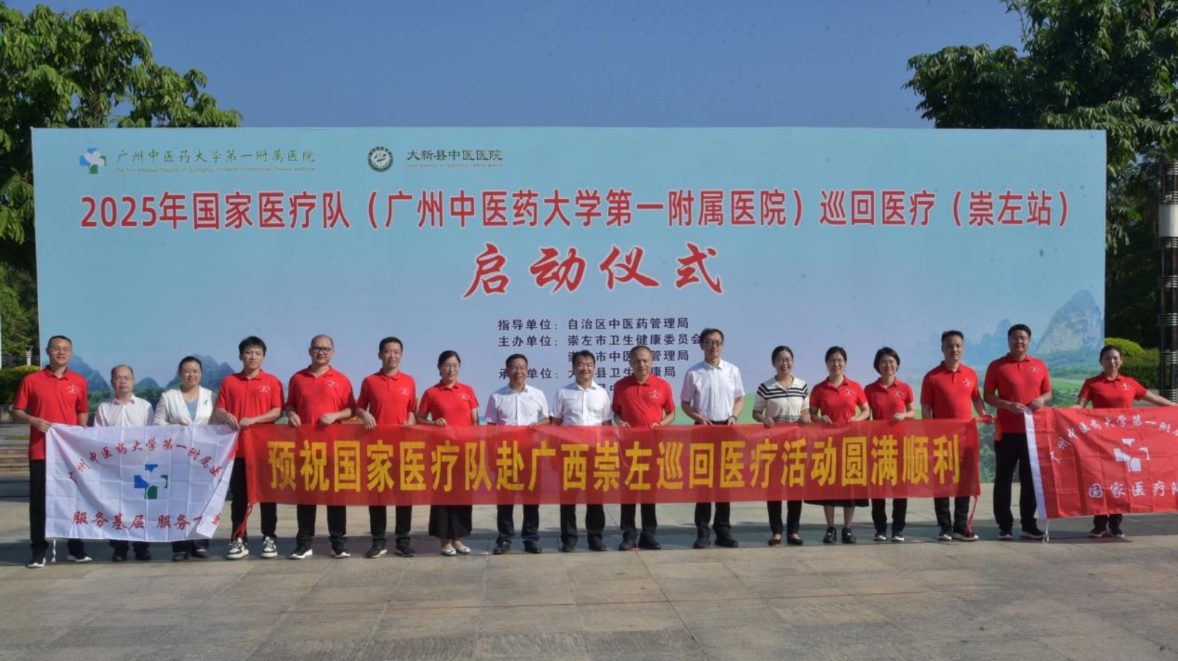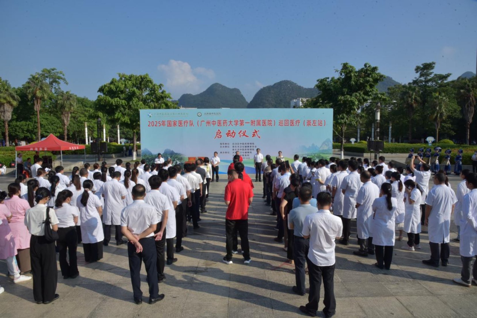 2025年10月10日,国家医疗队(广州中医药大学第一附属医院)巡回医疗(崇左站)启动仪式在广西崇左市大新县德天广场隆重举行。本次活动由广西壮族自治区中医药管理局指导,旨在落实国家优质医疗资源下沉政策,通过巡回医疗服务提升边境地区基层医疗卫生水平,切实解决群众“看病难、看病远”问题。广州中医药大学第一附属医院党委副书记章遐义,自治区中医药局党组成员、副局长潘霜,崇左市人民政府二级巡视员阮立平等领导出席活动并致辞,当地卫生健康系统代表、医护人员及群众共同参加活动。