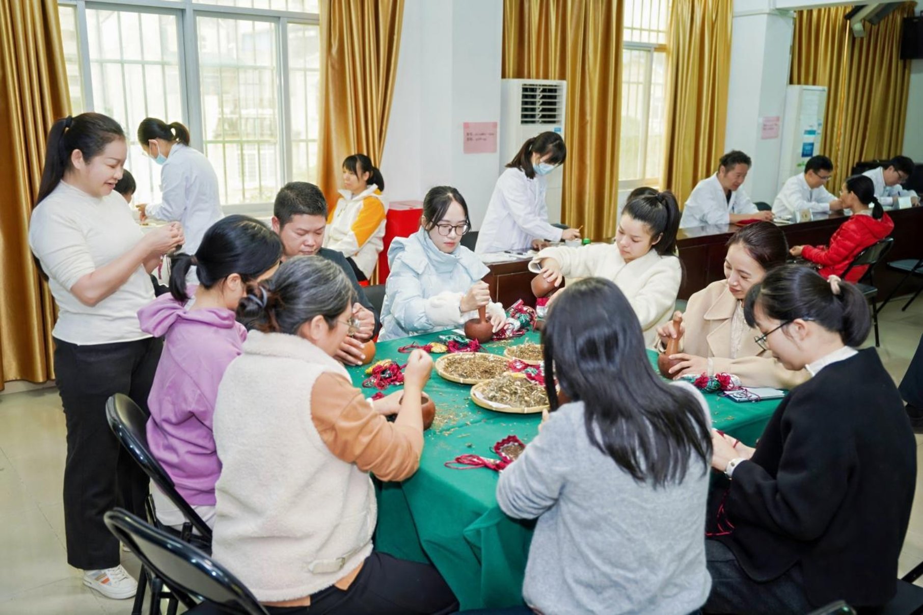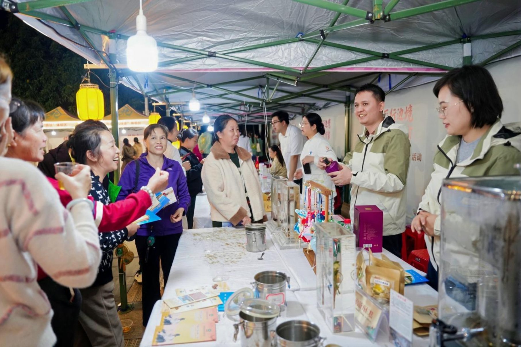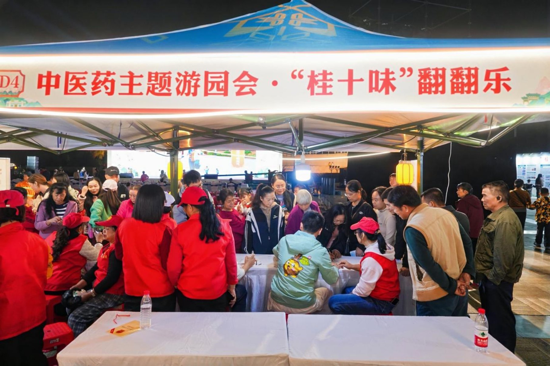 药膳展区药香四溢,壮瑶药膳茶饮广受欢迎;文创市集展示香囊、药锤、药枕、药浴包、壮药眼罩、十一方药酒等特色产品;互动区设有“香囊DIY”、“百草寻踪”挑战、“桂十味”翻翻乐、“中医减重打卡”等活动,让群众在轻松氛围中学习中医药知识、感受文化魅力。
