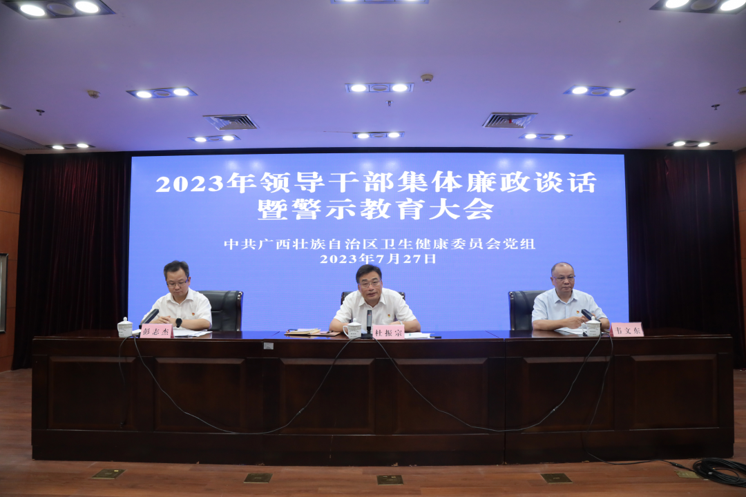 7月27日,自治区卫生健康委党组召开2023年领导干部集体廉政谈话暨警示教育大会。自治区卫生健康委党组书记、主任杜振宗出席会议并讲话,自治区党委主题教育第十巡回指导组副组长韦文东到会指导,自治区卫生健康委党组成员、驻委纪检监察组组长彭志杰主持会议。