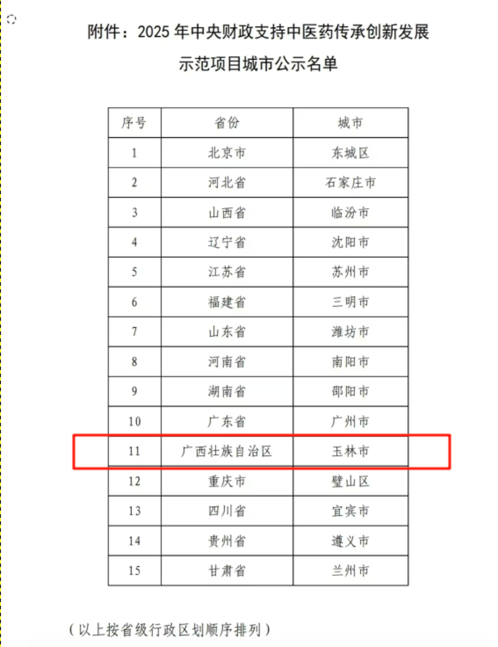 在财政部与国家中医药管理局联合组织的评选中,玉林市与广州等一线城市共同入选全国第二批15个示范城市名单(西部地区5个入选)。代表我区在中医药服务能力、产业基础、文化底蕴及改革创新潜力等方面,获得了国家层面的高度认可。